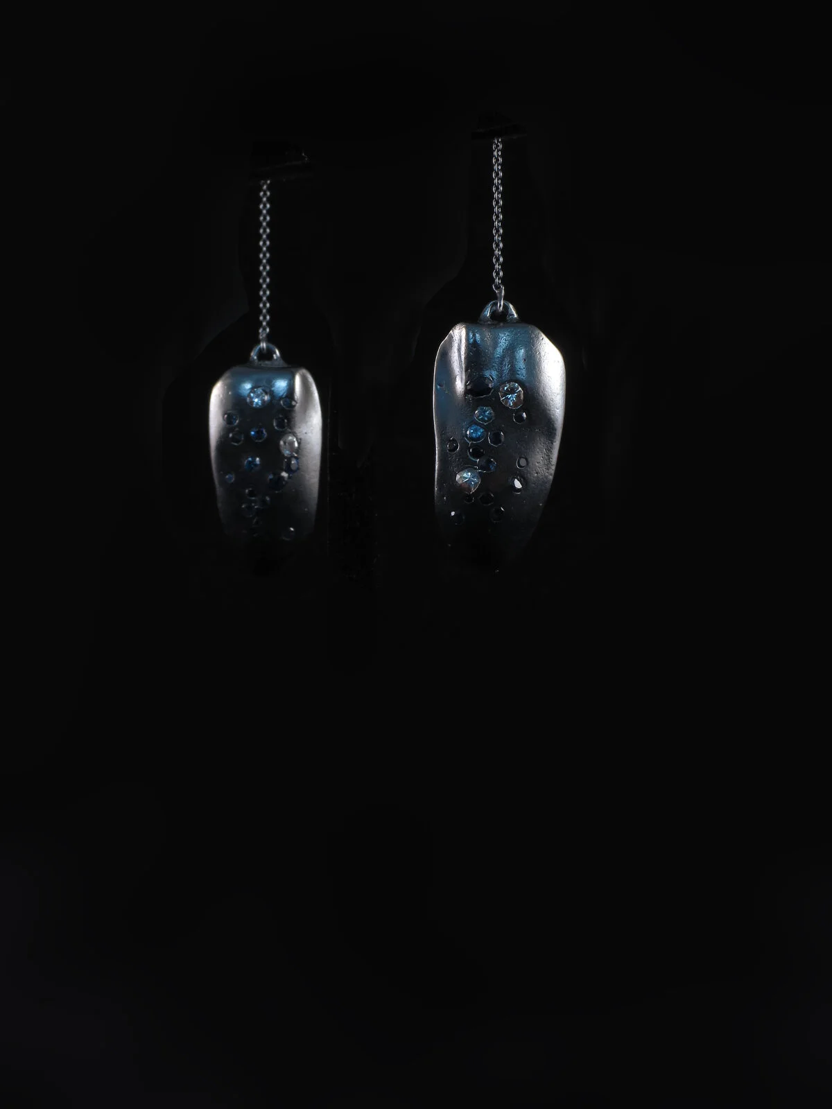 An articulated necklace, in oxidized 925 silver, decorated by stone-in wax set rubies ( synthetic ) or natural blue sapphires ( there are two versions )